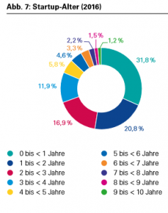 ist zu entnehmen, dass 91.8 % der ins Leben gerufenen Unternehmen nicht älter als 6 Jahre werden. Nur 1,2 Prozent der im Jahr 2016 untersuchten Startups sind überhaupt 9-10 Jahre alt. Das bedeutet, dass sich nur ein Bruchteil der Jungunternehmen in den letzten Jahren behaupten konnte. Erstaunlich gravierend, zeigt sich hier die Lage bereits in der Anfangsphase: So schaffen nur knapp über die Hälfte mehr als 24 Monate.